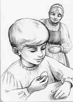 L'enfant, dix ans peut-être, fixe l'œuf dur qu'il tient dans sa main:
