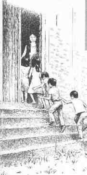 Pieds nus, les enfants suivent leur institutrice. Elle est sympathique, la maîtresse. Ses beaux cheveux longs et noirs tombent gracieusement sur une robe rose, sans manches.