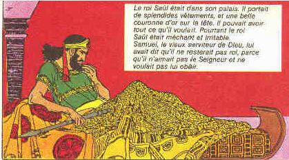 Le roi Saül était dans son palais. Il portait de splendides vêtements, et une belle couronne d'or sur la tête. Il pouvait avoir tout ce qu'il voulait. Pourtant le roi était méchant et irritable. Samuel, le vieux serviteur de Dieu, lui avait dit qu'il ne resterait pas roi, parce qu'il n'aimait pas le Seigneur et ne voulait pas lui obéir.