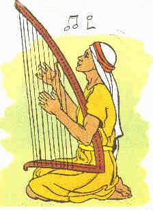 Ils s'approchèrent du roi et lui dirent: "Sais-tu ce que tu devrais faire, ô roi? Fais venir un homme qui sache bien jouer de la musique. Ce sera bon pour toi. Cela te guérira sûrement." Un des serviteurs dit: "J'en connais un. Il est berger à Bethléem. C'est un fils d'Isaï. Il joue très bien de la harpe, c'est merveilleux de l'entendre." "Bien, dit le roi, faites-le venir!" | ![]() |