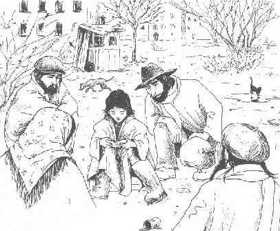 Un jour, quelques enfants de l'église font une promenade en attendant leurs parents. Les voilà dans le quartier des Tziganes. Que voient-ils, tout à coup? Quelques hommes et des femmes sont assis là-dehors près d'un feu qui s'éteint. Ils ont l'air d'écouter... Au milieu d'eux, un enfant tient un livre. Il le lit à haute voix. Ce livre, c'est la Parole de Dieu. Cet enfant, c'est Iulian. Il fait cela souvent, tout simplement.