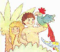 ![]() | Enfin, Dieu a créé l'homme et la femme: Adam et Eve. Il les installa dans un magnifique jardin, planté d'arbres aux fruits excellents: le jardin d'Eden. |