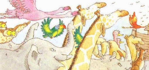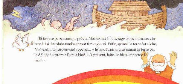 Dieu, les voyant si mauvais, décida alors de détruire ce qu'il avait créé. "Je vais faire tomber la pluie pendant si longtemps que toute la terre sera inondée", dit-il à Noé. Construis un bateau et prends-y place avec ta famille: ainsi vous serez sauvés! Tu y feras aussi entrer un couple de chaque espèce d'animal."