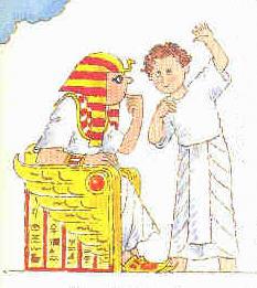 Les marchands emmenèrent Joseph en Egypte et le vendirent comme esclave à un homme important. Mais Dieu aida Joseph. Bien des nnées après, une nuit, Pharaon, roi d'Egypte, fit deux rêves étranges. Seul Joseph put les expliquer au roi. "Pendant sept années, il y aura de bonnes récoltes," dit Joseph, "puis il y aura sept années de famine!"