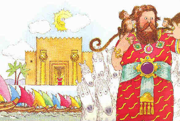 En l'honneur de Dieu, Salomon fit bâtir un temple magnifique à Jérusalem, fait de matériaux précieux. Il construisit aussi de somptueux palais. Ses navires lui rapportaient de très loin de l'or, des singes et des paons.