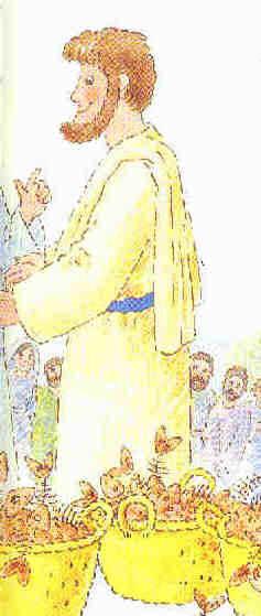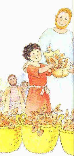 "Maître, cet endroit est désert, et les gens ont faim. Renvoie-les donc pour qu'ils trouvent de quoi se nourrir!" "Eh bien, donnez-leur vous-mêmes à manger!" leur répondit-il. "Mais cela nous coûterait une fortune!" répliqua un disciple. "Qu'avez-vous à leur donner?" leur demanda Jésus. "Il y a ici un garçon avec cinq pains et deux poissons dans son panier", dit André. "Mais ce n'est rien du tout. Il y a des milliers de gens ici!"Faites donc asseoir tout le monde sur l'herbe", demanda Jésus. | ![]() |