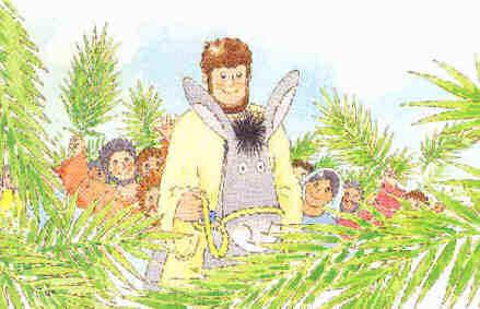 Mais pour aller à Jérusalem, Jésus est monté sur un sur un ânon. Il n'avait pas d'escorte de soldats, mais des foules de gens vinrent l'acclamer en jetant sur son chemin des rameaux et leurs manteaux en criant: