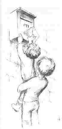 ![]() | Un autre jour, il s'agit d'aller glisser une dizaine de lettres à la boîte. Cette correspondance est très importante. Jeannot reçoit donc toutes les recommandations qu'on peut faire à un enfant quand il ne doit rien perdre. Cette fois, notre petit ami part tout seul, pour gagner du temps. Mais au bout d'un moment, il rentre à la maison, tenant toujours à la main le précieux courrier. Sans déranger ses parents occupés dans la pièce voisine, Jeannot s'adresse à son petit frère: Les deux enfants s'en vont, la main dans la main. Jeannot doit avoir combiné quelque chose. Chemin faisant, il semble confier une importante mission à Etienne. Suivons-les, et observons bien! Tiens... ils s'arrêtent à l'angle de la deuxième rue, juste sous la boîte aux lettres. Alors Jeannot donne le courrier à son petit frère, se baisse, passe les bras autour des jambes d'Etienne, et fait un gros effort, au risque de perdre l'équilibre avec son lourd fardeau. Puis, de la tête, il montre l'endroit où les lettres doivent être glissées. Jeannot est encore trop petit pour arriver là-haut, mais avec Etienne, ça doit mieux aller. Tout va bien, en effet. Mais Jeannot ne se doute vraiment pas de ce qui va se passer dans quelques instants... |