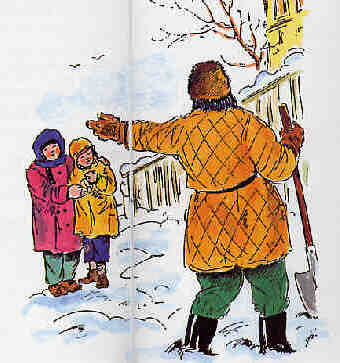 – Que faites-vous là? demande soudain une grosse voix juste derrière eux. Les enfants se retournent en sursaut. Un inconnu dans une sorte d'uniforme pose sur eux un regard interrogateur.