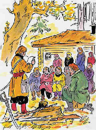 Chevaux et cavaliers suivent le long chemin qui traverse la forêt. Pavel est en tête. Il aime n'avoir devant soi que le visage paisible de la nature sauvage. Brusquement, il tire sur la bride. Son cheval s'arrête net au bord du chemin. Sur leur monture, ses compagnons l'imitent.