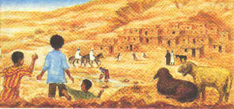 Aouacha ne s'est pas trompée. A présent, le ciel devient tout rouge, et les ombres s'allongent. Alors le douar sort de son sommeil. Dans les ruelles, la vie réapparaît. Déjà quelques femmes se montrent en robe de fête: voiles blancs ou de couleur, ornés de fils d'or ou d'argent. Et regardez leurs cheveux, regardez la paume de leurs mains ! D'où vient cette couleur rouille? Ah! c'est là leur secret. Avec les feuilles du henné (arbuste d'Arabie), elles savent fabriquer leur teinture de beauté.