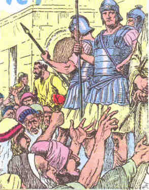 | Vous voyez, on a arrêté Jésus comme un malfaiteur! Plus tard, on l'a jugé. "Je ne trouve en lui aucun crime!" a dit Pilate, le gouverneur. Jésus n'avait rien fait de mal! Pourtant Pilate a permis à la foule de faire de Jésus tout ce qu'elle voulait. Alors ils l'on tué! Ils l'ont cloué sur une croix! Puni à tort, Jésus ne s'est pas défendu. Il a souffert pour nos péchés, lui juste pour des injustes, afin de nous amener à Dieu. |