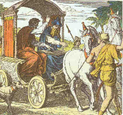 Bientôt, le char s'ébranle. Il emmène le grand personnage vers sa lointaine Ethiopie. C'est un ministre, gardien de tous les trésors de la reine Candace, quel poste de confiance! Mais ce haut dignitaire, qu'est-il venu faire à Jérusalem?