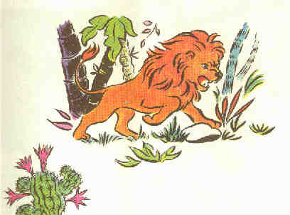 Qui est le plus surpris? Ce doit être le lion, brutalement tiré de son sommeil par ce choc. Effrayé, il ne fait qu'on bond et, poussant un cri rauque, déguerpit comme un malfaiteur!