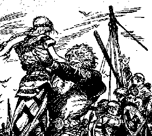 Un soir que la fillette guettait, à son poste habituel, elle vit des points sombres paraître à l'horizon. Un... deux... trois... Les points sombres grossirent, et la vue perçante d'HeIga distingua bientôt trois drakkars. Folle de joie, elle courut vers la maison en criant: