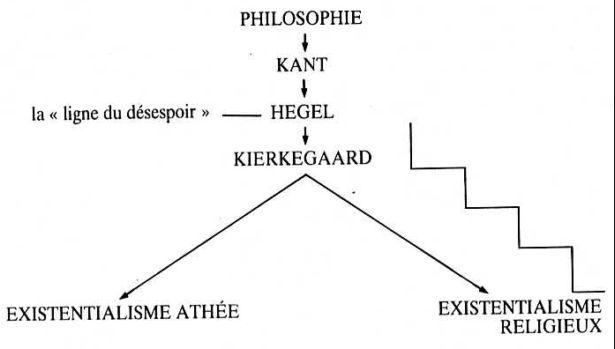 Pourquoi attribue-t-on à Kierkegaard cette paternité? Quelle modification a-t-il apporté à la pensée de Hegel? Kierkegaard est arrivé à la conclusion qu'il était impossible de parvenir à la synthèse par la raison et que, pour résoudre les questions essentielles, il fallait le saut de la foi. Il distingua donc totalement le domaine de la foi et celui du rationnel et du logique.