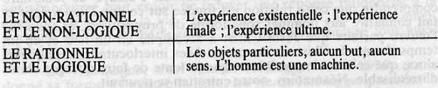Désormais, le rationaliste qui veut comprendre ce qui est essentiel (tel que le sens de la vie ou la valeur de l'amour) doit abandonner toute réflexion rationnelle et lui substituer un immense saut irrationnel de la foi. Ainsi, puisqu il est impossible de faire appel à la raison pour trouver des réponses, il faut renoncer à l'espoir de découvrir un champ unifié de la connaissance. D'où la dichotomie suivante: