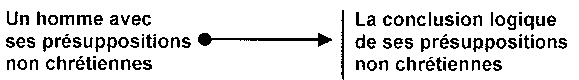 Rappelons-nous que tout interlocuteur, qu'il soit vendeur ou étudiant, admet une série de présuppositions, que celles-ci aient été analysées ou non. Dans le schéma ci-après, le point représente les présuppositions d'un non- chrétien et la flèche leur conclusion logique.