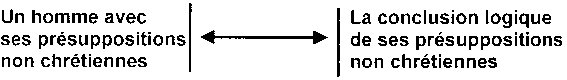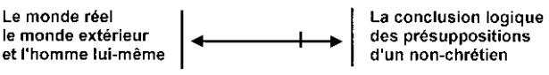Chaque homme se trouve quelque part sur la ligne qui va du monde extérieur à la conclusion logique de ses présuppositions non-chrétiennes (voir schéma ci-dessus). Chaque être humain se sent écartelé entre deux logiques: celle qui l'entraîne vers le monde extérieur et celle qui l'entraîne vers son système. Il peut laisser osciller le pendule entre les deux, mais il ne peut pas vivre à la fois dans les deux. Il vivra plus près de l'une ou de l'autre selon l'intensité de leur attraction à un moment donné. Avoir à choisir entre une logique ou l'autre est un véritable enfer. Plus le non-chrétien est logique avec ses présuppositions, plus il s'éloigne du monde réel; plus il est proche de celui-ci, plus il est inconséquent.