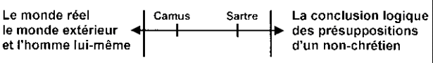Sartre a eu raison de dire que Camus n'était pas conséquent avec leurs présuppositions, mais il ne l'a pas été davantage lui-même. En signant le Manifeste algérien, c'est-à-dire en adoptant une attitude réellement morale, lui aussi a été inconséquent. Il est donc également dans une situation de tension. Chaque personne peut aller et venir, selon les circonstances, sur la ligne (voir schéma ci-dessous), mais la plupart du temps elle se stabilise, plus ou moins, en un certain point. Tout non-chrétien, qu'il dorme sous les ponts de Paris ou dans un appartement bourgeois, se trouve forcément sur cette ligne.